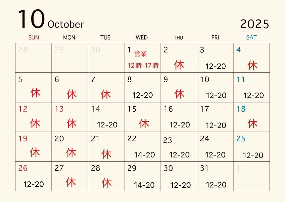 営業時間 火〜土14:00から20:00 日・祝12:00から18:00 月曜日定休